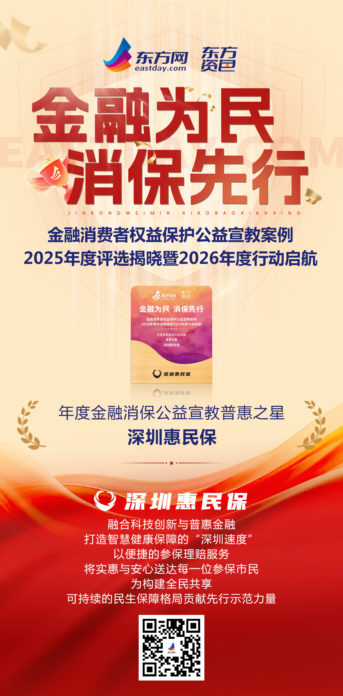 金融为民,消保先行。由东方网银行保险频道主办的“金融消费者权益保护公益宣教案例2025年度评选揭晓暨2026年度行动启航”活动近日揭晓评选结果。深圳市民生保障典范产品——“深圳惠民保”,凭借其在普惠金融与消费者权益保护方面的突出贡献,荣获“年度金融消保公益宣教普惠之星”称号。这一荣誉不仅是对“深圳惠民保”三年来坚守初心的肯定,也标志着深圳在推动金融消费者保护与普惠金融深度融合方面走在全国前列。